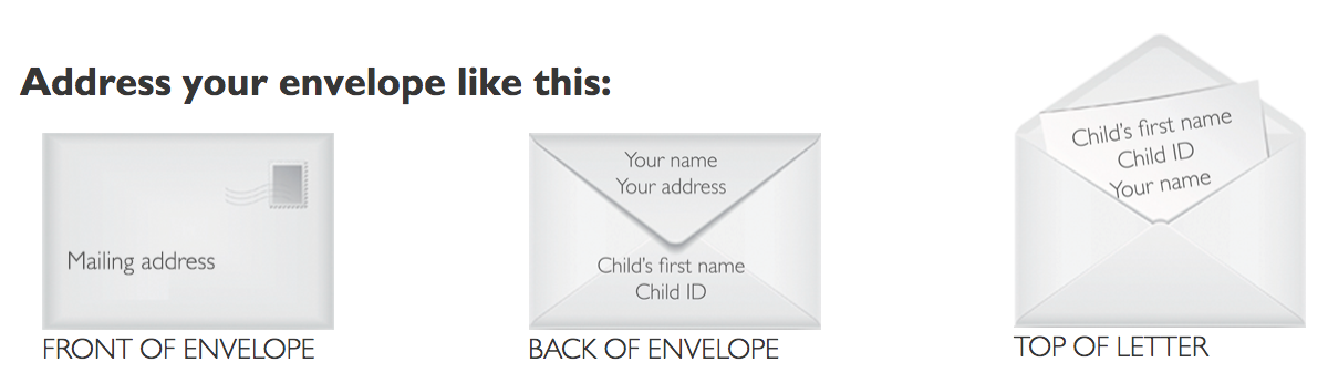 - Be sure to include your child’s first name and child ID number on the envelope and on your letter.